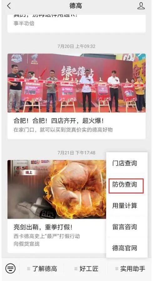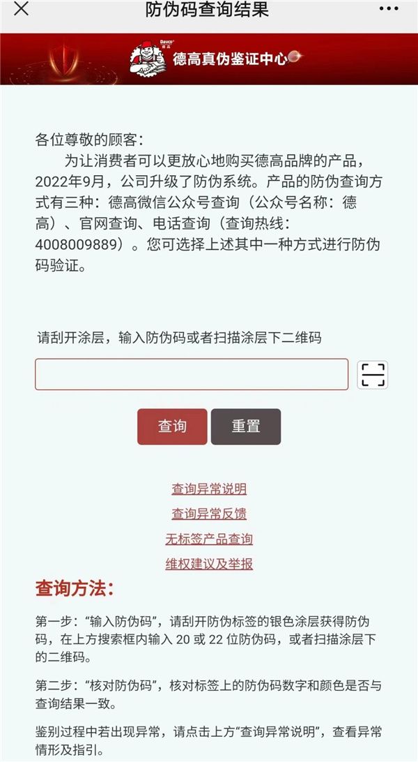 强烈推荐从德高官网、微信德高公众号右侧菜单栏进入防伪查询页面
