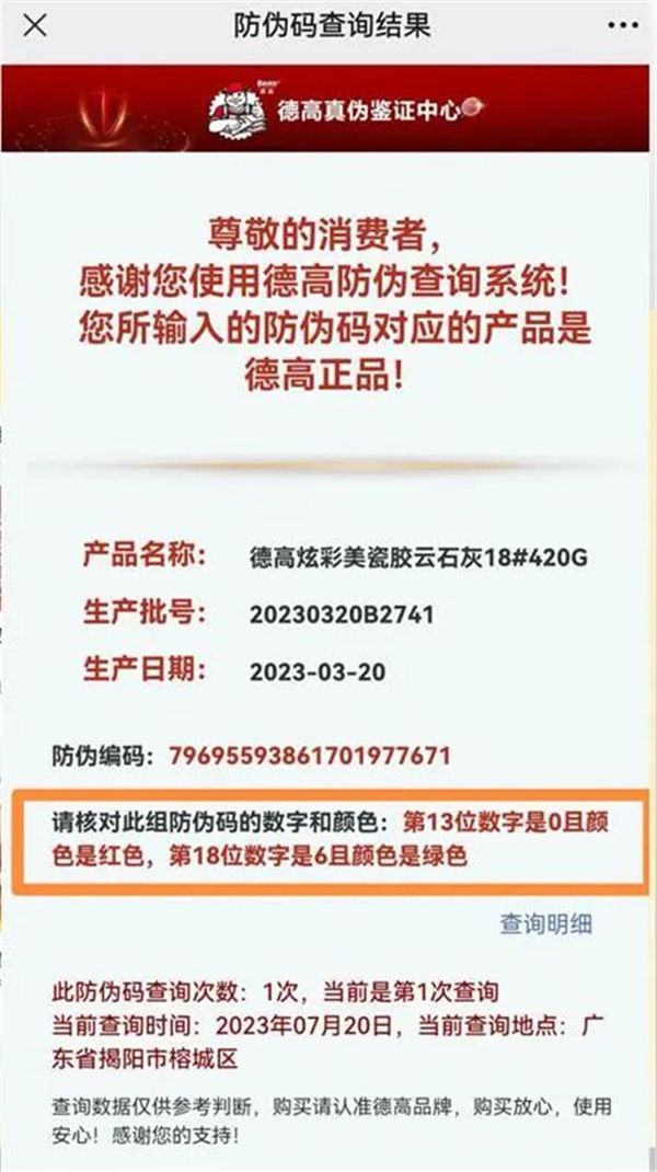 三查:当然,德高防伪四码合一,还可通过官方渠道(官网/德高微信公众号)扫码查真伪: