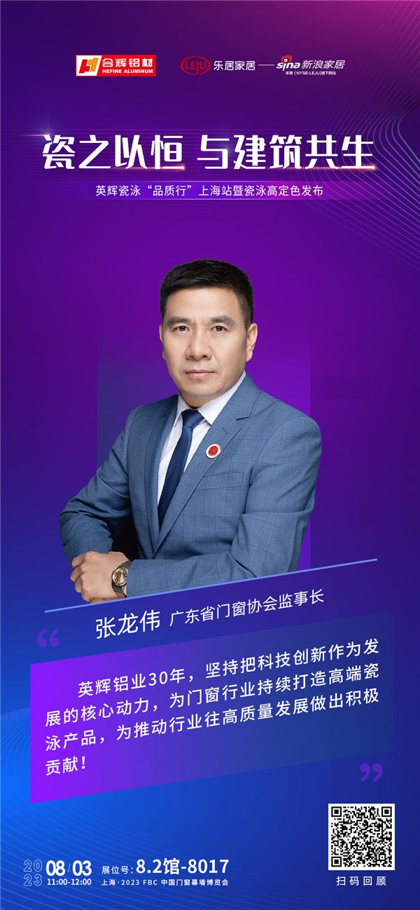 8月3日,在2023 FBC中国国际门窗幕墙博览会上,英辉铝业携手新浪家居在【上海国家会展中心8.2馆-8017】举行「瓷之以恒 与建筑共生」英辉瓷泳“品质行”上海站暨瓷泳高定色发布会,向世界展示中国高端瓷泳,重磅发布瓷泳X珐琅丝高定色,以英辉瓷泳“品质行”赋能建筑可持续发展!