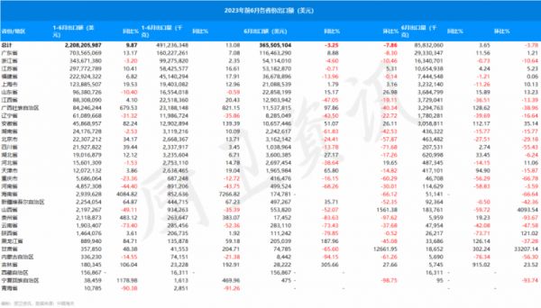 1-6月,前三大省份中浙江略微下跌,广东和江苏略微增长。广东省出口703565069美元,同比增长13.17%,出口量达到160227261千克,同比增长7.08%。另外,广西壮族自治区同比增长679.53%,达到84246244美元。
