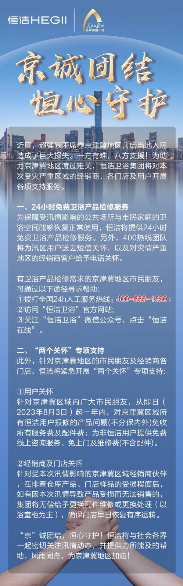 针对京津冀区域内广大市民朋友,从即日(2023年8月2日)起一年内,对京津冀区域所有恒洁用户报修的产品问题(不分保内外)免收所有服务费及配件费;为非恒洁用户提供免费线上咨询服务、免上门及维修费(不含配件)。