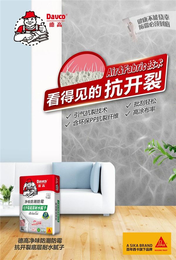德高净味防潮防霉抗开裂底层耐水腻子采用Air&Fabric技术,产品一打开就能明显看见,有效抗裂的“纤维”!