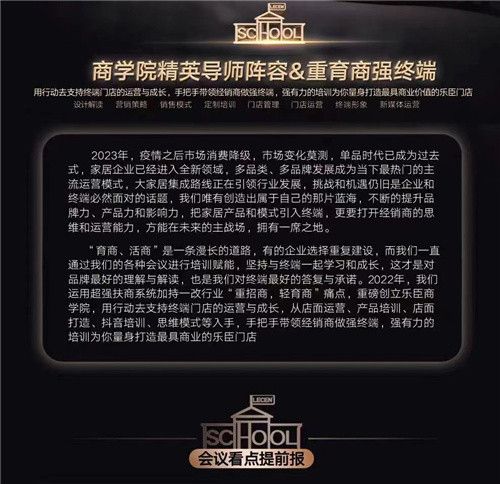 8月22日-8月23日,乐臣品牌强大商、精英特训营第二期正式在中国·武义美林阁酒店开启,此次会议的精彩内容“助力终端整合资源、提升销售能力、运营全品类的发展模式、运用自媒体打开市场流量、活动策划能力、提升大家思维与认知”特邀请行业知名大咖与我们精英团队一起帮助终端实现业绩增翻、成为当地建材行业最闪耀的明星。商学院精英导师阵容 × 重育商强终端,一起共同学习新模式,共创美好未来。