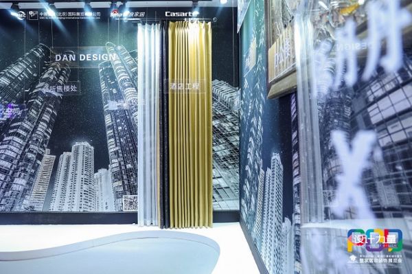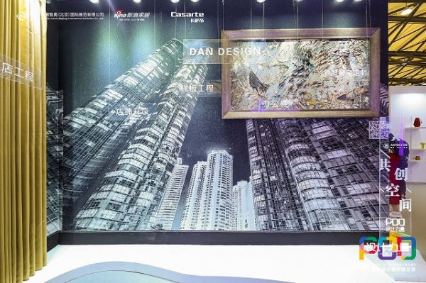 【陈丹丹】:我的展位主要是告诉人家我是做什么的,比较简单粗暴一点。我用亚克力吊牌挂了所有自己参与设计过的类型项目,比如说餐饮空间、售楼处、小建筑改造等,也有酒店工程、办公室和私宅定制这一块。再告诉人家我们有做施工设计落地,展位比较小,我们主要呈现方式是用卡萨地的大显示屏呈现,我们的赞助商艾是软装也帮我们做了墙面的墙布,选了一款他们的明星产品来点缀我们的空间。他们的窗帘产品是纯度比较低的暖黄色,根据这个窗帘配了一幅艺术家的画,把整个调性和氛围感打造出来。