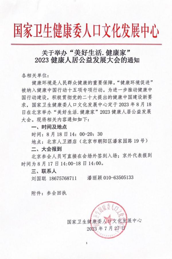 健康环境是人民群众健康的重要保障。“健康环境促进”被纳入健康中国行动十五项专项行动。为进一步推动健康中国行动落地,积极主动贯彻党的二十大提出的健康中国建设要求,国家卫生健康委人口文化中心定于2023年8月18日在北京举办“美好生活.健康家”2023健康人居公益发展大会。