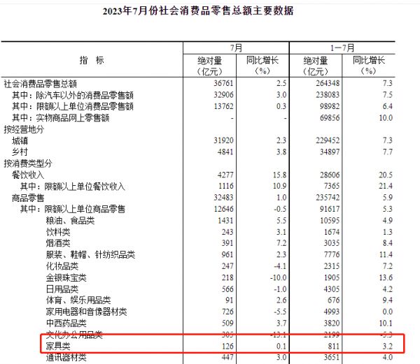 其中,7月份,家具类零售额为126亿元,同比增长0.1%;建筑及装潢材料类零售额122亿元,同比下降11.2%。1-7月份,家具类零售总额为811亿元,同比增长3.2%;建筑及装潢材料类零售额853亿元,同比下降7.3%。
