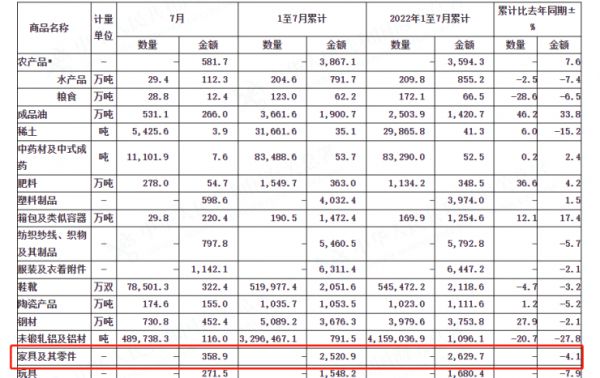 从7月份单月来看,家具及其零件出口额为358.9亿元,环比下滑1.6%;陶瓷产品出口额为155亿元,环比增长2.4%;灯具、照明装置及其零件出口额为272.8亿元,环比增长3.7%。