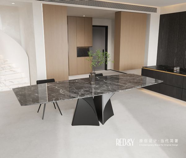 桌腿部分由对称的两部分组成,交错的直线和曲线随视角的不同而变换,具有强烈的艺术性和雕塑感,轻易占据视觉中心。而桌面则采用经典的橄榄型,委婉的弧线中和了腿部线条的硬朗。桌身整体搭配不同的餐椅,可以形成不同的风格倾向,在空间尺寸适配的条件下,极简或奢华风格皆可驾驭。