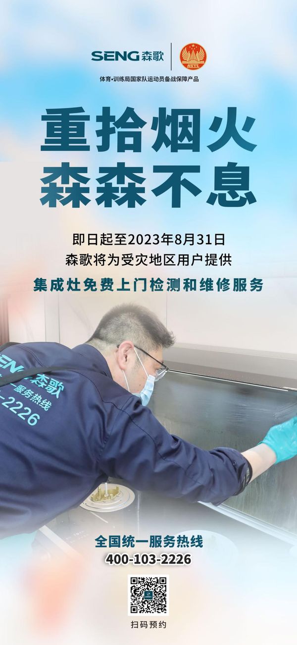 森歌秉持“专注品质 专心为你”的服务理念,构建行业领先的服务体系,以全国覆盖的营销网络优势形成了高效响应、极速行动的高端品质服务。此次针对受灾地区的专项服务活动,森歌也将全力激发自身服务体系优势,加大服务投入、提升响应速度,以更优质、更高效的服务体验,全面保障用户权益,作为业内率先提出对受灾用户提供免费服务的品牌,森歌将以极致服务力做好模范带头作用,诠释强企担当,彰显企业大义凛然的正能量。