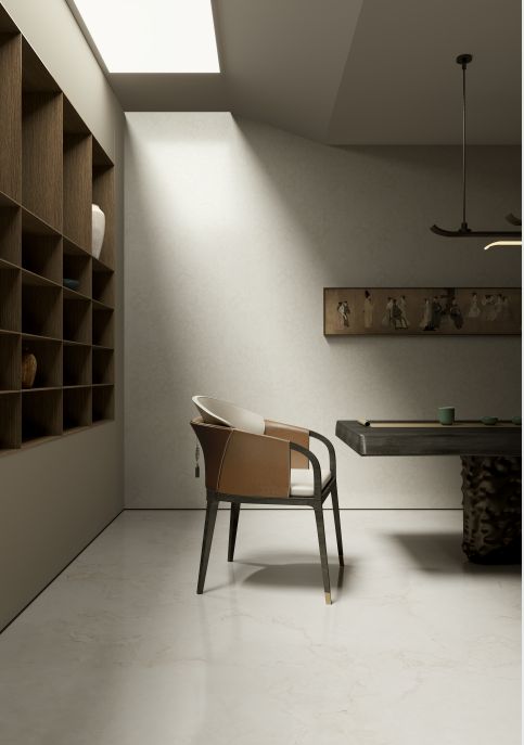站在三米之外,你将看到的是一面典雅的纯色墙壁,予人宁静与和谐。这是ARROW箭牌瓷砖书香轻纹系列的独特设计理念真正体现的地方:通过降低纹理的冲击,寻找实用性与美学的完美结合。这种别具匠心的设计旨在创造一个纯净且优雅的阅读环境,无干扰,无打扰。纹理的隐藏,仿佛正在细语一种沉静的力量,质朴而内敛,让你更专注于字马之间,思绪如云。