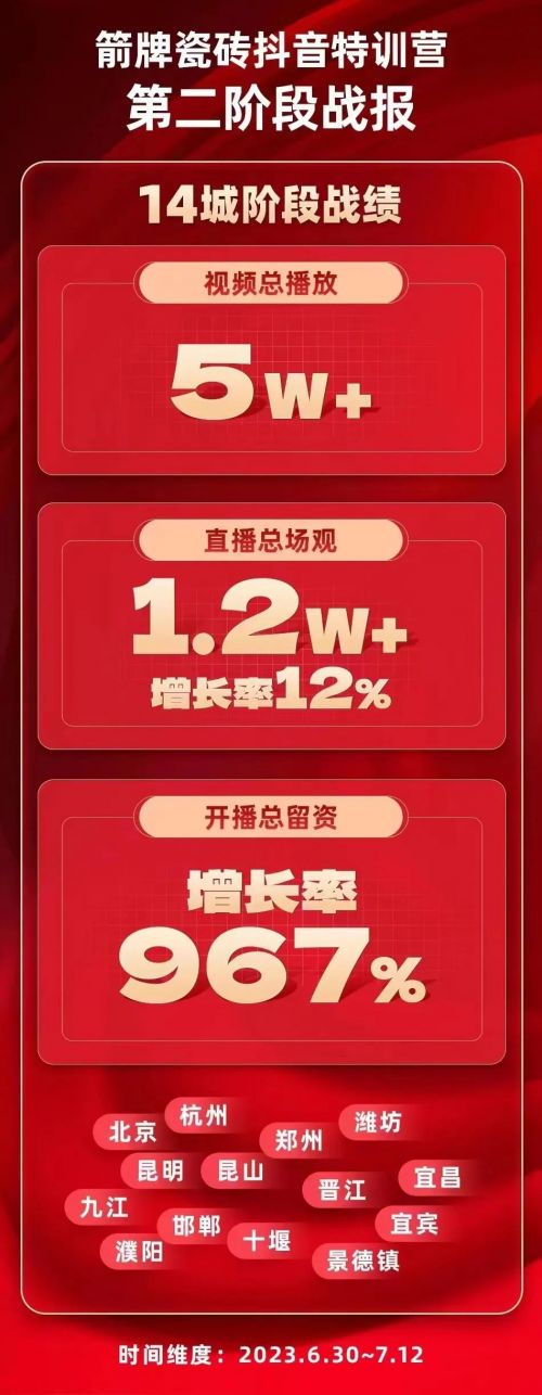 箭牌瓷砖稳抓流量风口,在近段时间启动的抖音特训营项目中高效布局营销矩阵,截止8.11,参与抖音特训营项目的经销商视频总播放量达到17w+,同比第二阶段效果增长240%!引爆线上流量更上一台阶!