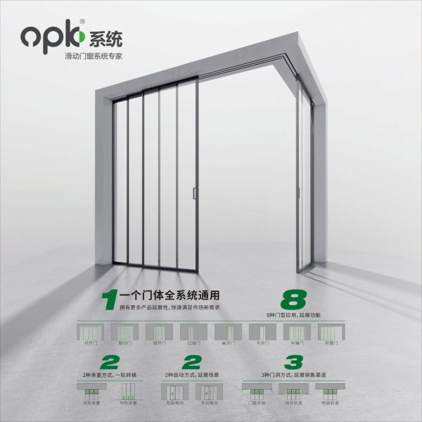 它的一个门体全系统通用,是opk欧派克产品系统化能力的体现,通过变更其中的一两个型材或某个配件,可以实现8种门型应用、2种承重方式、2种启动方式、3种门洞收口方式,让客户拥有更多产品延展性,快速满足市场新需求。