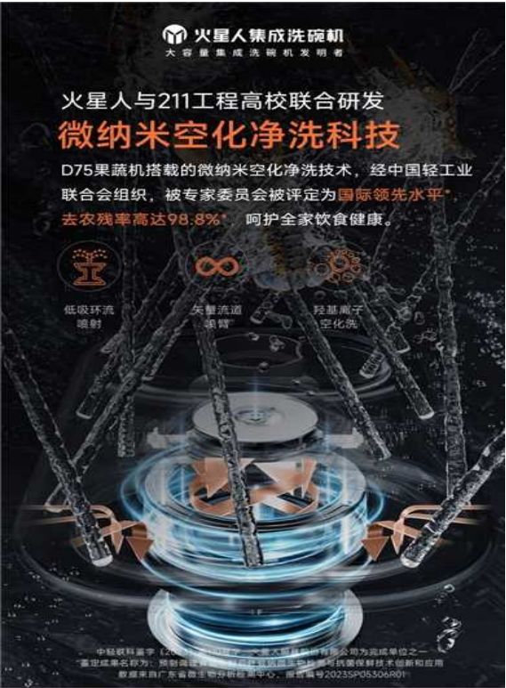 目前市面上常见的去农残技术如下:臭氧技术,是现在国际上已经淘汰的技术,味道刺鼻,易形成有害致癌物;超声波清洗,只能通过高频振荡将食物表面的泥沙虫卵灰尘洗掉,无法解决果蔬中农药残留和激素抗生素的食品污染问题,同时噪音非常大;普通气泡洗,利用高压水流带动果蔬翻滚,通过气泡与果蔬接触时破裂产生的能量去除农残,但随着气泡能量衰弱,去农残率不甚理想。相较于以上几种方式,火星人D75集成洗碗机使用的微纳米空化净洗科技,去农残率更高,达到98.8%,且不产生有害物质,果蔬绿色健康放心吃。