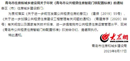 青岛市出台《青岛市公共租赁住房智能门锁配置标准》