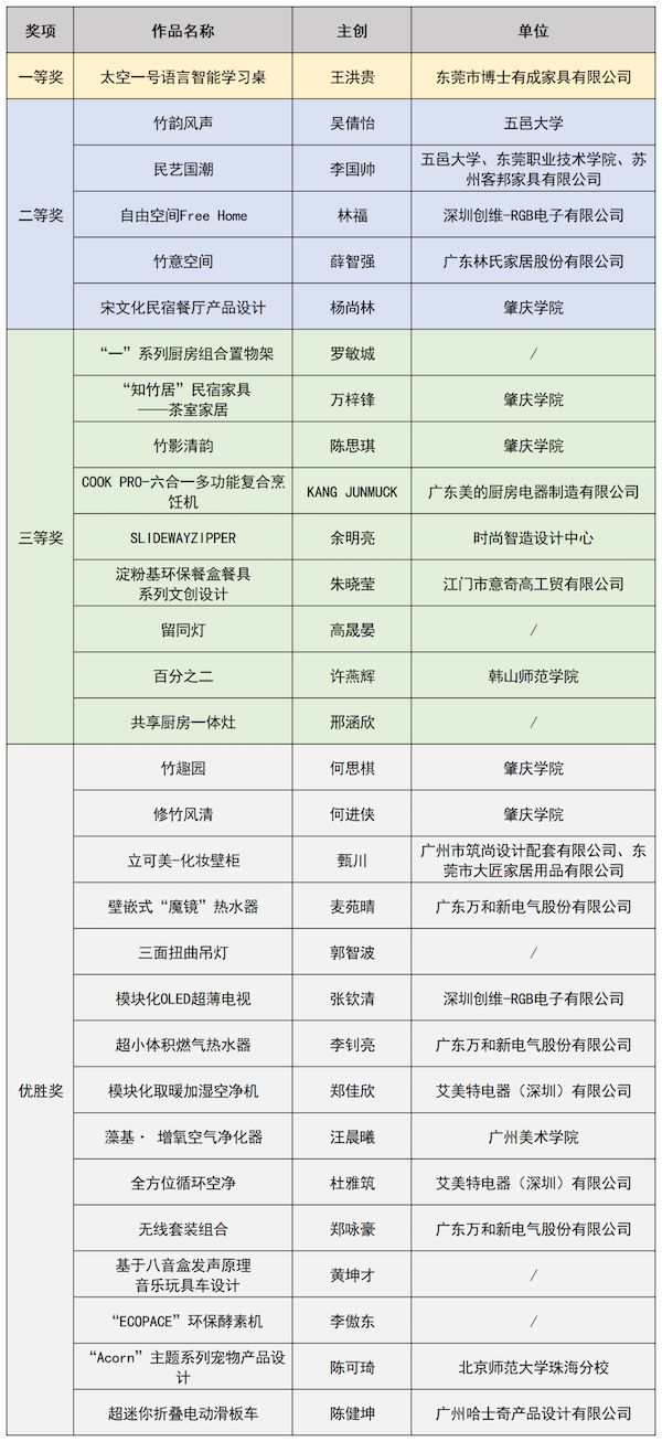 第十一届“省长杯”工业设计大赛由广东省工业和信息化厅主办,广东工业大学承办。其中,泛家居专项赛由广东省家具协会承办,自启动以来,得到企业、院校、设计师踊跃报名。入围泛家居复赛的作品数量达1265名,概念设计组720名,产品设计组545名,是复赛总数三分之一,涵盖家具、家电、灯饰、厨卫、器皿、户外、文教、体育、玩具、园艺等作品。经评审,共评出60名获奖作品,概念设计组和产品设计组一、二、三等奖各1、5、9名,优胜奖各15名。推荐254名参加决赛,概念设计组和产品设计组分别144名、110名。其中,4名在决赛中获绿色创新等奖项,250名获优秀奖,不少作品正在成为市场畅销的商品,可喜可贺。
