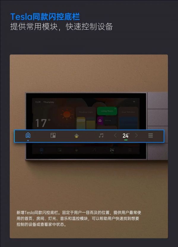 l Telsa同款闪控底栏,提供用户最常使用的首页、房间、灯光、音乐和温控模块,可以帮助用户快速找到想要控制的设备或查看家中状态。