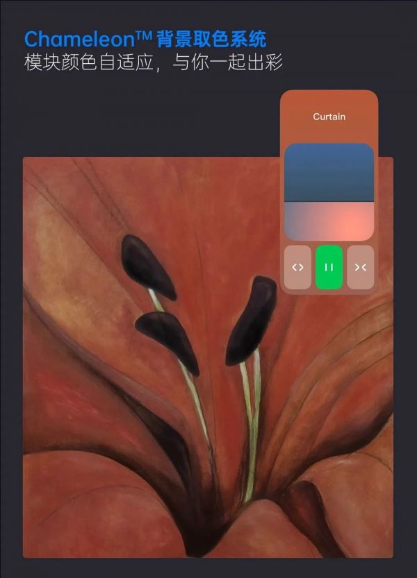l Chameleon™ 背景取色系统可实现半透明玻璃效果,模块底色可自适应用户个性化壁纸颜色,让生活更出彩。