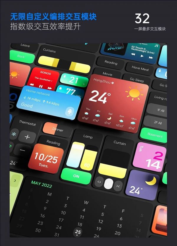 l 支持无限自定义编排1x2,2x2和2x4的设备、场景、天气、日历、时钟等卡片模快,交互效率至高提升800%。