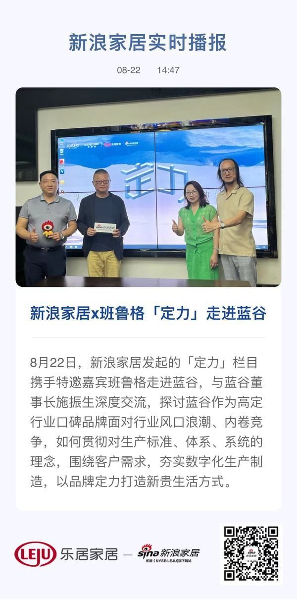 8月22日,新浪家居发起的「定力」栏目携手特邀嘉宾班鲁格走进蓝谷,与蓝谷董事长施振生深度交流,探讨蓝谷作为高定行业口碑品牌面对行业风口浪潮、内卷竞争,如何贯彻对生产标准、体系、系统的理念,围绕客户需求,夯实数字化生产制造,以品牌定力打造新贵生活方式。