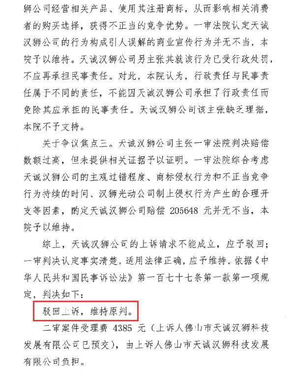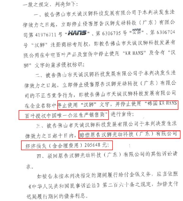 近年来,有不法厂商傍用HANS汉狮品牌,打品牌擦边球,在市场上傍用正品汉狮来鱼目混珠销售低劣产品,既扰乱了市场,误导了社会公众,损坏消费者权益,也严重侵犯了我们的合法权益。为维护企业合法权益,践行中空百叶细分领域的行业责任和担当,自2020年始,汉狮光动科技(广东)有限公司(以下简称“汉狮”)充分发动员工和社会各界力量收集假冒仿冒汉狮证据,最终于2021年7月以侵害商标权为由向广东省佛山市禅城区人民法院提起民事诉讼、请求法院判令被告立即停止侵权行为,赔礼道歉、消除影响。经过立案受理,2022年8月3日广东省佛山市禅城区人民法院诉讼已宣判,判定被告行为构成商标权侵权,并支持了汉狮的诉讼请求。日前,2023年1月10日,广东省佛山市中级人民法院二审驳回佛山市天诚汉狮科技发展有限公司上诉,维持原判。至此,汉狮打假维权第一站宣告最终成功!