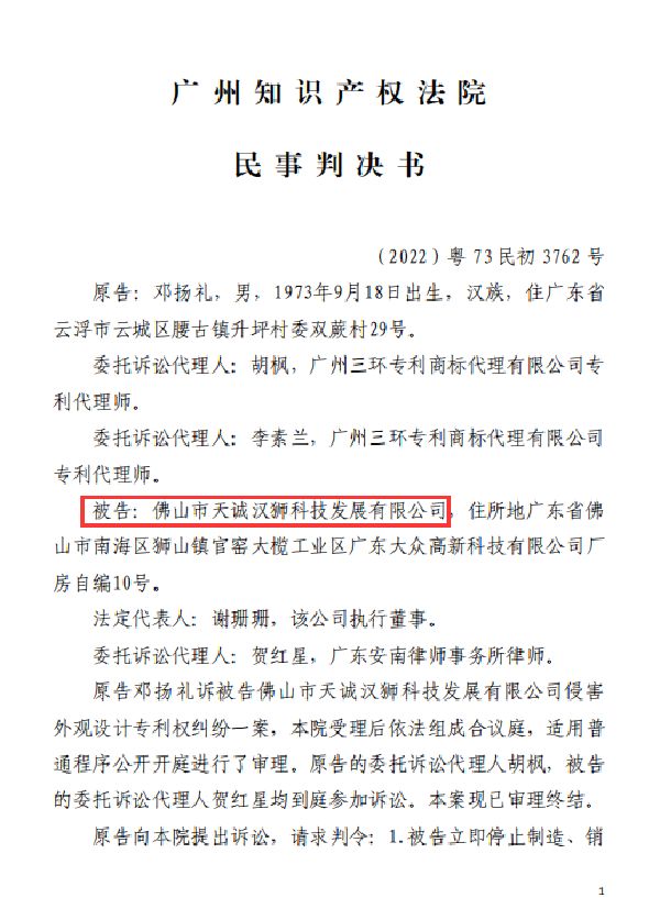在商标维权成功后,汉狮针对冒防产品打假维权行动,取得阶段性突破。在2022年7月向广州知识产权法院提起向佛山市天诚汉狮科技发展有限公司侵害外观设计专利诉讼。日前,广州知识产权法院诉讼已宣判,判定被告行为外观专利侵权,并支持了汉狮的诉讼请求。
