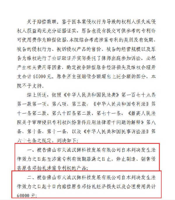 一、被告佛山市天诚汉狮科技发展有限公司自本判决发生法律效力之日起至涉案专利有效期届满之日止,停止制造、销售侵害原告邓扬礼涉案专利权的产品;