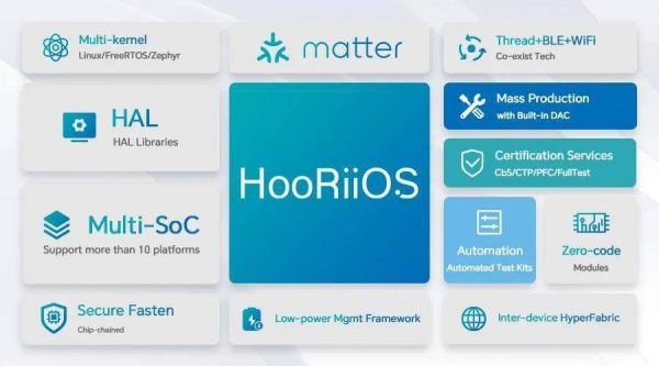值得一提的是,HooRiiOS 还是 Matter 生态中支持多芯片平台的物联网操作系统。HooRiiOS 可针对Matter生态提供丰富的 API 接口和示例代码,支持 Zero-code 模组,提高 Matter 解决方案的交付基线,帮助开发者高效完成 Matter 产品从0到1的搭建。