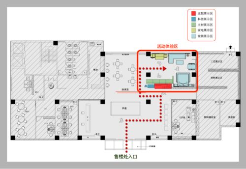 展区位于售楼处的核心功能区,紧邻洽谈区。主题展区恰好面对入口方向,业主踏入第一眼即可瞥见主题展区的展示内容,直观地引发他们的兴趣。此举不仅能在视觉上吸引业主,同时也直接显现了活动的主题,激发起业主的好奇心。