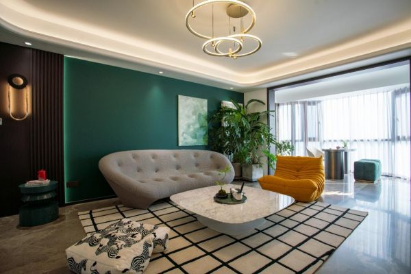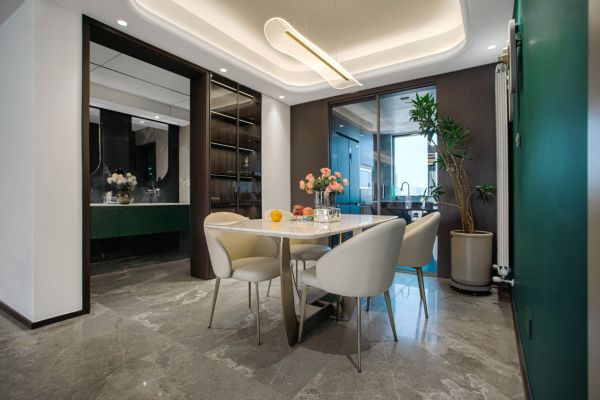 简洁的线条和纯色富有质感的亮色背景,就是整个客厅的基调,绿色代表的是生命,带给人向上的力量和自信,是新鲜和喜悦的颜色。软装融入金属,棉麻,岩板,绿植等元素。通透的玻璃窗将景色、光线和美好的心情引入空间,诠释优雅,空灵,纯粹的私宅美学概念。