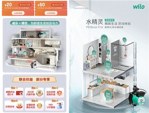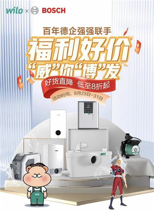 在这样的背景下,京东一年一度的秋季家装节于近日正式开启,家电家装板块持续让利优惠。其中,德国两大工业巨头威乐和博世首次联手,在“Wilo威乐京东自营旗舰店”和“博世壁挂炉京东自营旗舰店”两个各自的官方店铺中,以威乐水家电的家用水泵和博世的壁挂炉等产品为主,定制优惠福利,回馈消费者,以实际行动响应促消费号召。