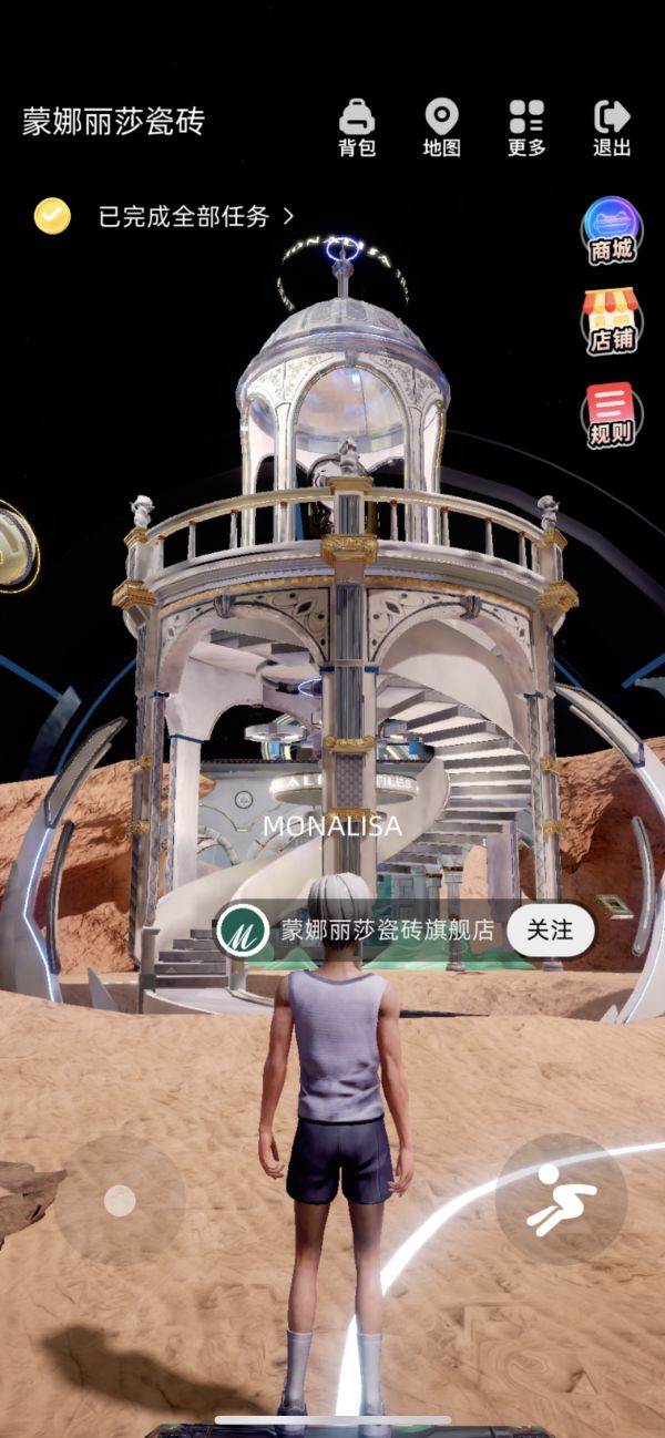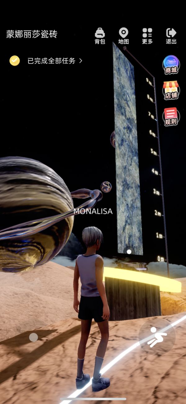 在虚拟的星球环境中,蒙娜丽莎陶瓷大板、岩板产品纹理与环境结合,消费者可创建个性化虚拟形象,沉浸式自由探索蒙“蒙娜丽莎星球”元宇宙空间。