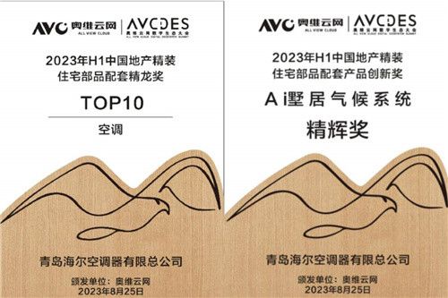 此外,本次大会也针对地产配套市场进行了评选。在获奖名单中,海尔空调获得了“2023年H1中国地产精装住宅部品配套精龙奖TOP10”,其原创AI墅居气候系统则获得了“2023年H1中国地产精装住宅部品配套产品创新奖精辉奖”。