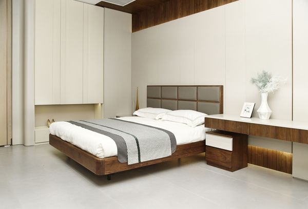黑胡桃实木的胡桃色+真皮床屏的星空灰,充满艺术感与自然活力,在静谧氛围中营造令人心动的生活美学,让居住者可以带着理性与冷静沉浸于思考,亦可以在慵懒与虚度中消磨着时光。