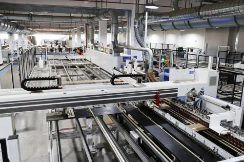 板芙工厂的生产线用到了目前世界上先进的生产设备,包括RGV、机械手、德国豪迈670柔性封边U型连线/通过式220钻孔机、拓雕六面钻、智能检测、机器人书本架立存、自动裁纸包装等多套设备,并依靠AI管理,将多种生产模式结合,从而能够减少生产成本。