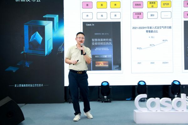 紧接着,奥维云网厨卫事业部总经理赵志伟从数据的角度,为大家带来了关于市场发展趋势的分享,他提到二季度市场脉冲式复苏,家电零售迎来触底反弹,而嵌入式大盘则是以复合机拉动,整体呈现回暖的态势,而凯度从大盘向下到市场回暖,在嵌入式蒸烤赛道的规模都呈现快速增长的趋势,连续位居2022H1-2023H1线上第一;并且销售的产品结构不断改善,均价上行,逐渐拉近与核心竞争对手的价差;更重要的是,凯度围绕核心技术“双热风”,爆品能力显著,单品机型效率极高,在市场创造一个又一个优秀的成绩!他也非常看好此次发布的凯度微魔方旗舰新品,并对新品大卖表示了真心地祝愿!