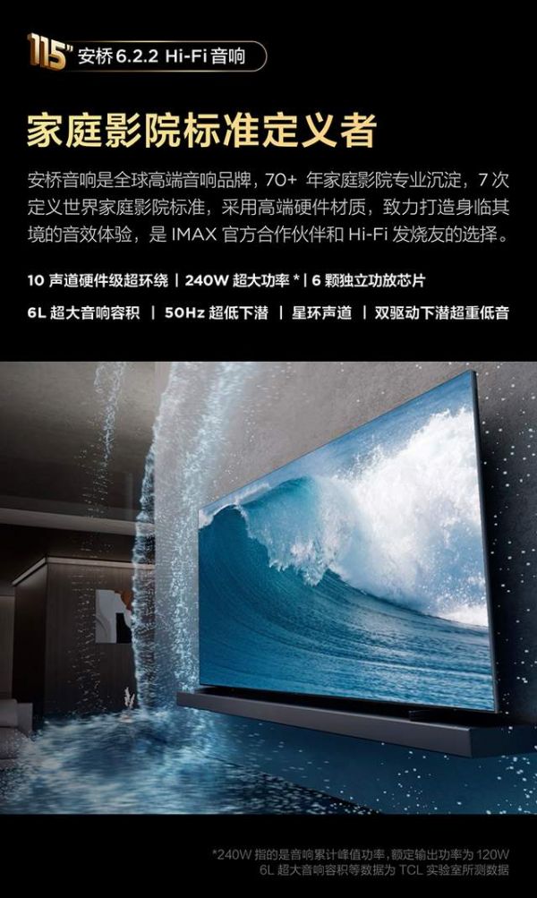 为此之前还做过一些功课,投影仪在视听上俨然已经没办法满足豪宅人群对极致视听体验的需求,然而目前市面上主流的98吋以及100吋电视在尺寸上缺少了能够凸显身份地位的稀缺感以及视野上的极致感, 音画配置上和大尺寸相比,也并没有做到同样极限的升级,最后发现都没有满意的,直到昨天在TCL发布会上看到它家最新推出的全球最大Mini LED电视,同时也是全球第一台20000+级分区QD-Mini LED电视——115"X11G Max,从尺寸、画质以及音质上看,都远超我的预期。
