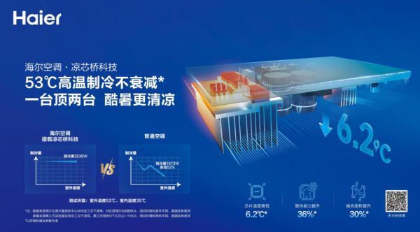 再延伸一点,海尔空调和地产商合作,可以对后装需求进行整体的营销联动,而在前装工程环节可以与地产合作伙伴进行外立面到内部空间装饰、装修的联合设计。最近这两年,行业出现最频繁的问题是空调外机运行热保护的问题,这个问题困扰了很多房地产开发商。过往,没有考虑到外机散热的问题——空调运行在过高温度环境会发生热保护故障,而去年很多地方地表温度最高达到55度,空调周边温度达到了60多度。那么,海尔空调做这些产品设计的时候,第一是考虑空调外机的设计,通过空调外机搭载了先进的凉芯桥技术,实现环温在53℃保持运行效率不衰减,58℃依然可以正常运行。