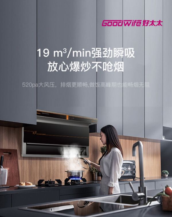 油烟一直是诸多家庭厨房中的“顽疾”,Goodwife好太太至尚套系Pro 之油烟机CXW-200-8219,拥有强劲大吸力19m³/min不跑烟,轻松应对无压力,低处进烟腔吸走初起油烟,顶部烟口拢住升腾油烟。