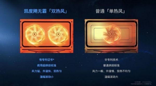 作为凯度的独门绝技,飓无霸双热风的优秀有口皆碑,对比行业普通的单热风,能够做到升温更快,温场更匀,控温更精准,温幅波动更小,甚至可达到商用级烘焙标准,无论是热效率提升效果,还是烘焙上色效果,抑或烘焙熟嫩效果等指数对比,凯度飓无霸双热风的表现都堪称完美!