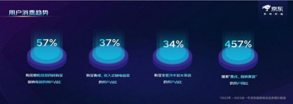 中国家电网发布的《2023中国厨房&电器“嵌入式/集成/一体化”趋势》调研显示,由于中国家庭厨房面积普遍较为狭小,橱柜、厨电一体化套装,以及各种集成式、嵌入式产品受到更多青睐。京东近一年来的厨房相关品类数据佐证了上述结论:“集成”“厨房空间”的搜索量同比增长457%,购买橱柜品类同时购买厨房电器的用户占比57%,越来越多消费者倾向于家装家电一站式购买。