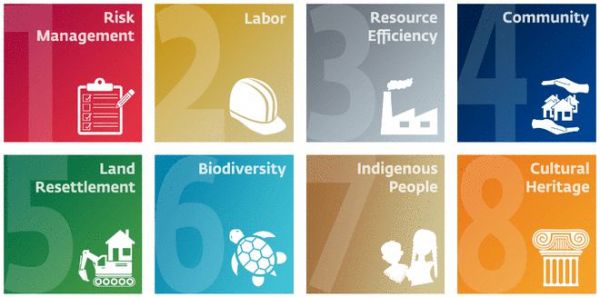 环境与社会可持续性绩效标准包括8个大类:1.环境和社会风险与影响的评估和管理 2.劳工和工作条件 3.资源效率和污染防治 4.社区健康、安全和治安 5.土地征用和非自愿迁移 6.生物多样性保护和生物自然资源的可持续管理 7.土著居民 8.文化遗产
