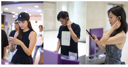 现场赛博蓝紫色展台抓人眼球,光影绚酷的超人气全息科技沉浸式投影装置,传达了浓厚的科技氛围感。展台上放置了多副Denon PerL系列真无线蓝牙降噪耳机,可现场试听,随时体验HiFi定制。工作人员的贴心指导,全新耳机的沉浸体验,参与者亲耳感受“私人订制”的独特质感与美妙,探索声音的无限精彩。