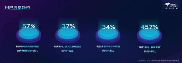 2022年~2023近一年京东厨房相关品类增长数据显示,搜索集成、厨房套装的用户同比增长了457%,购买集成、嵌入式厨电品类的用户占比37%。这深刻佐证了一体化厨房新趋势的到来,也说明了家电、家居品牌从“散装厨房”走向整体化的必要性。