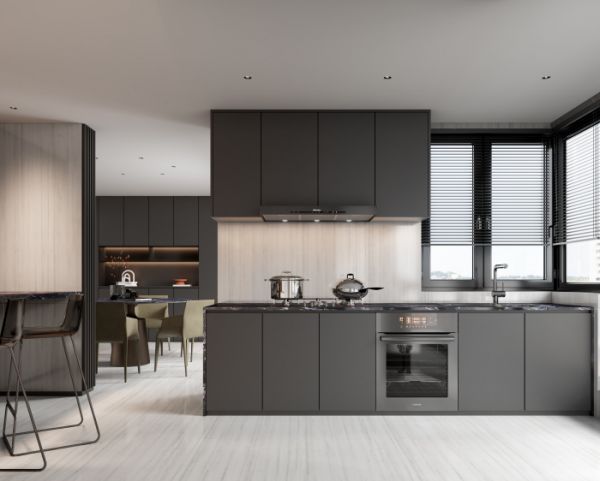 厨房中,设计师利用精工奢石台面作为铺垫,展开一片高级简约的基地,深色的餐桌椅与整体空间形成色调上的对比,丰富了空间的层次,中岛台上方的圆筒灯极具简约感,十分耐看,干净又有格调,更让厨房增添一份温馨的氛围。