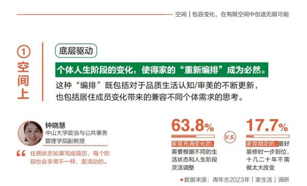 年轻人希望家生活能带来安全感、幸福感和美感,从中获得更高的情绪价值,首当其冲就是空间上的:年轻人对于家生活认知和审美是在不断更新的。根据「青年志2023家生活调研」数据,63.8%年轻人认为家是充满变化的,需要根据不同人生阶段和状态进行调整。比如对于墙面装饰来说,你可能在某一个阶段特别喜欢墙纸墙布,再过一个阶段又开始倾向于艺术漆;春夏两季可能特别中意绿色系墙面,秋冬时又对温暖的亮色系情有独钟……