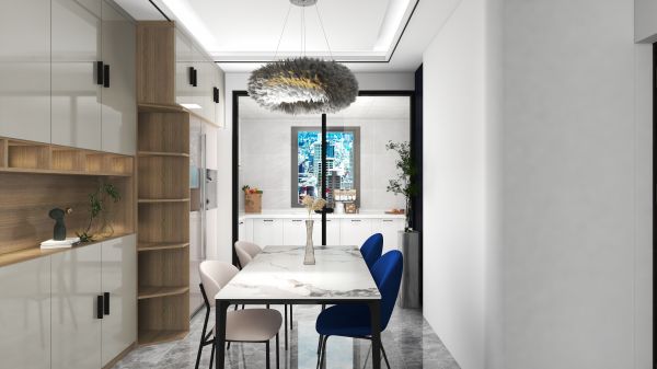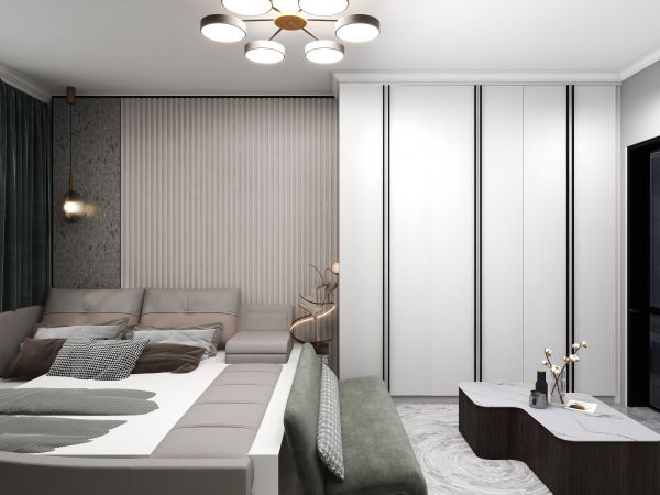 为了实现空间的充分利用,我们采用了简约而精致的家具布局。主卧室的床头柜设计巧妙地将吊灯融入其中,既满足了照明需求,又为房间增添了独特的氛围。客厅的沙发选择了L型设计,既舒适又时尚,同时还为客人提供了多种座位选择。餐厅区域配备了伸缩桌面,既满足了平时单独居住的需求,又方便了与朋友聚餐时的用餐体验。