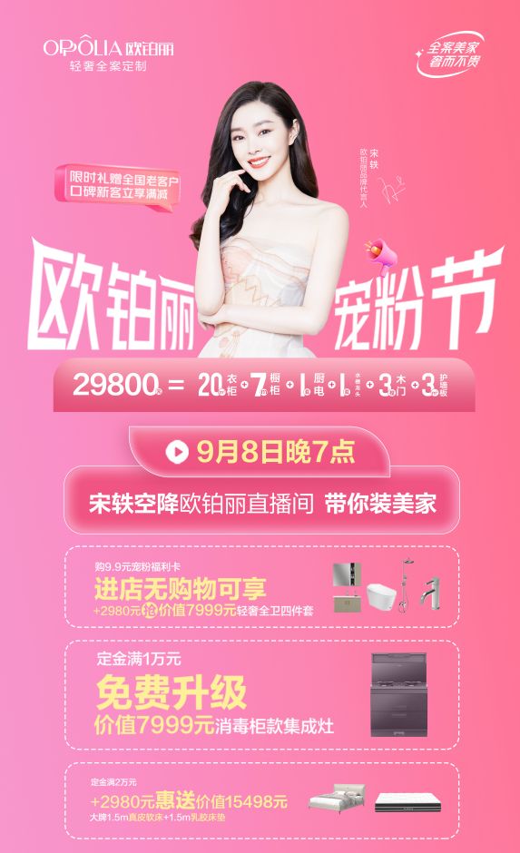想轻松收获全案美家?9月8日19:00,欧铂丽与宋轶一同约定"欧铂丽宠粉节"直播间,欧铂丽全房STORE京东、天猫、抖音、快手、视频号直播间和点淘APP在线狂欢,惊喜直播价以及众多宠粉福利等你来抢,马上行动吧~
