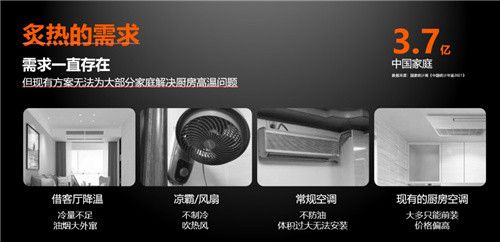第一,厨房制冷产品、方案能不能经受住中式厨房烹饪油烟的考验;第二,能不能在厨房明火烹饪和各种电器热源下,实现快速降温和持续大冷量;第三,在已经装修好的厨房中,能不能不用重新吊顶,实现安装不会破坏装修。
