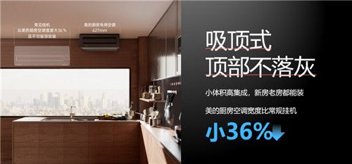 针对这部分用户,我们推出了吸顶式厨房空调产品,将整体体积宽度做到62.7cm,比常规的挂机的体积小了36%,并且可以贴着房屋顶部安装,在相对拥挤的中式厨房中能够找到更灵活的安装位置,例如,冰箱上方、橱柜角落,甚至窗台上,等等,可以在有限的厨房空间中满足不同安装需求。