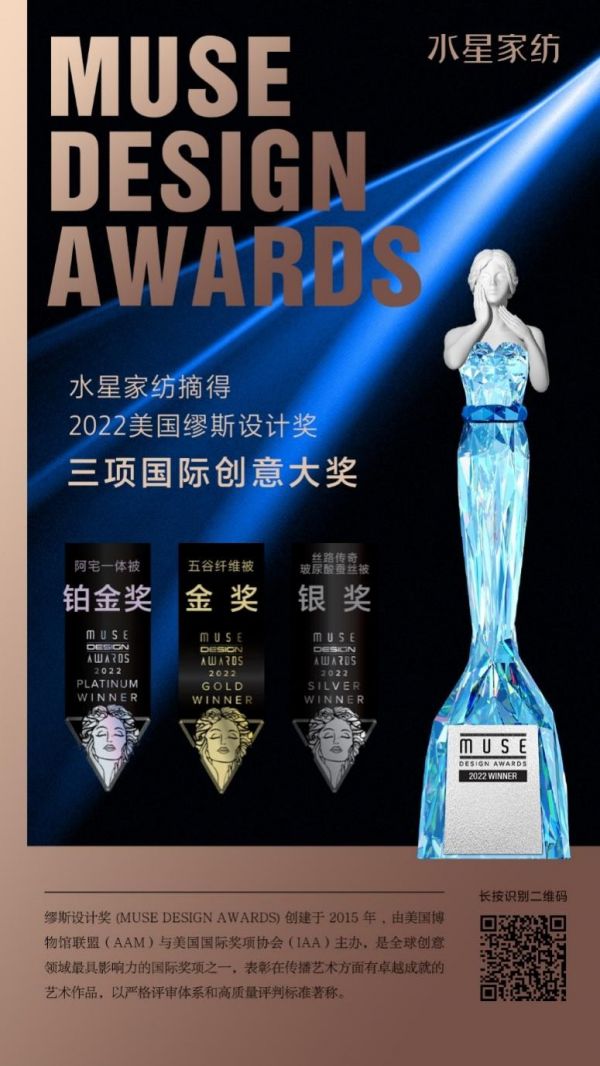 当然除了注重技术的研发,水星家纺在产品设计方面更是有着独到的见解,推出的“阿宅一体被”、“玻尿酸蚕丝被”、“蚕丝羽绒被”、“五谷纤维被”接连斩获美国缪斯设计奖、法国DNA奖、欧洲好设计奖,让中国品牌赢得国际权威认可,在世界舞台上闪闪发光。